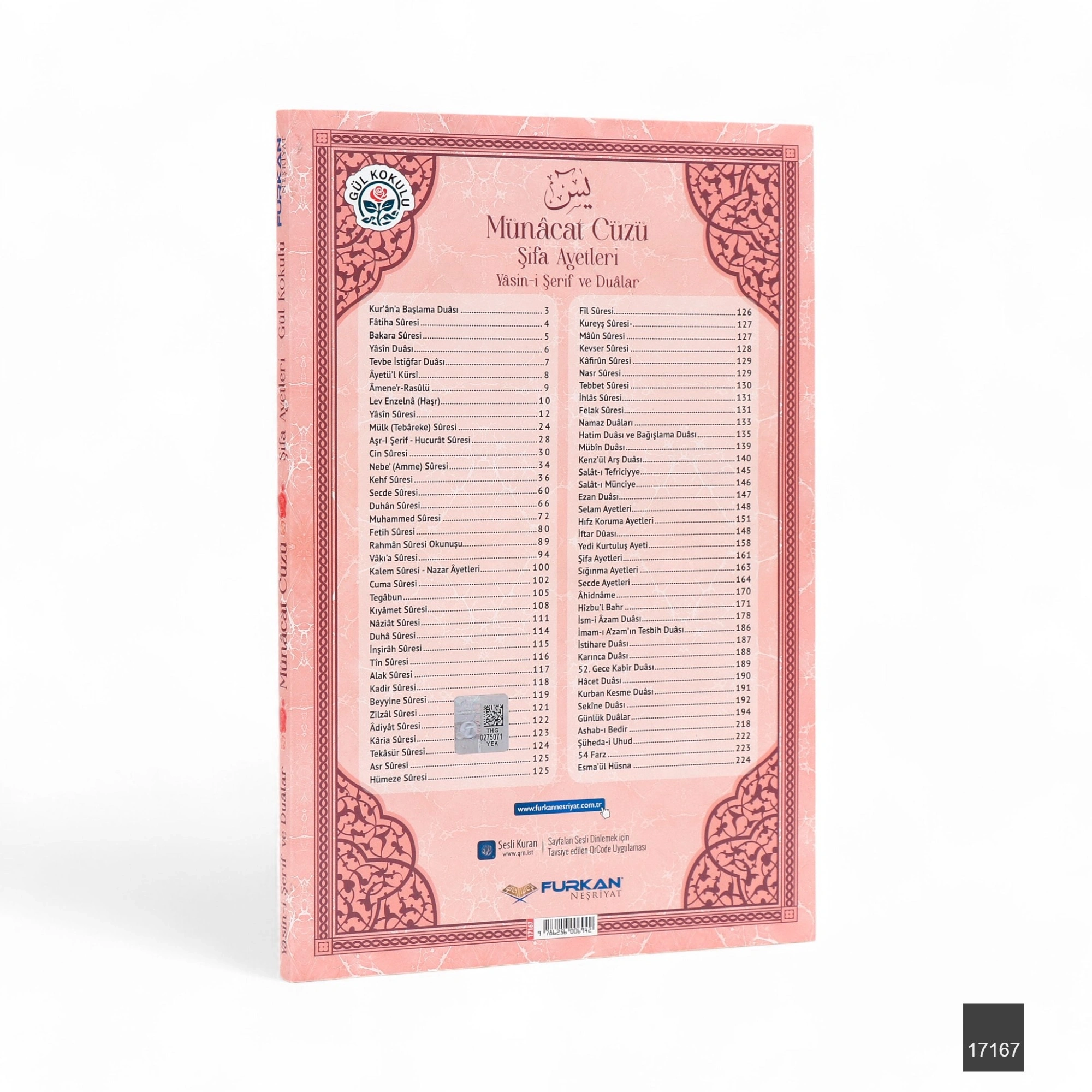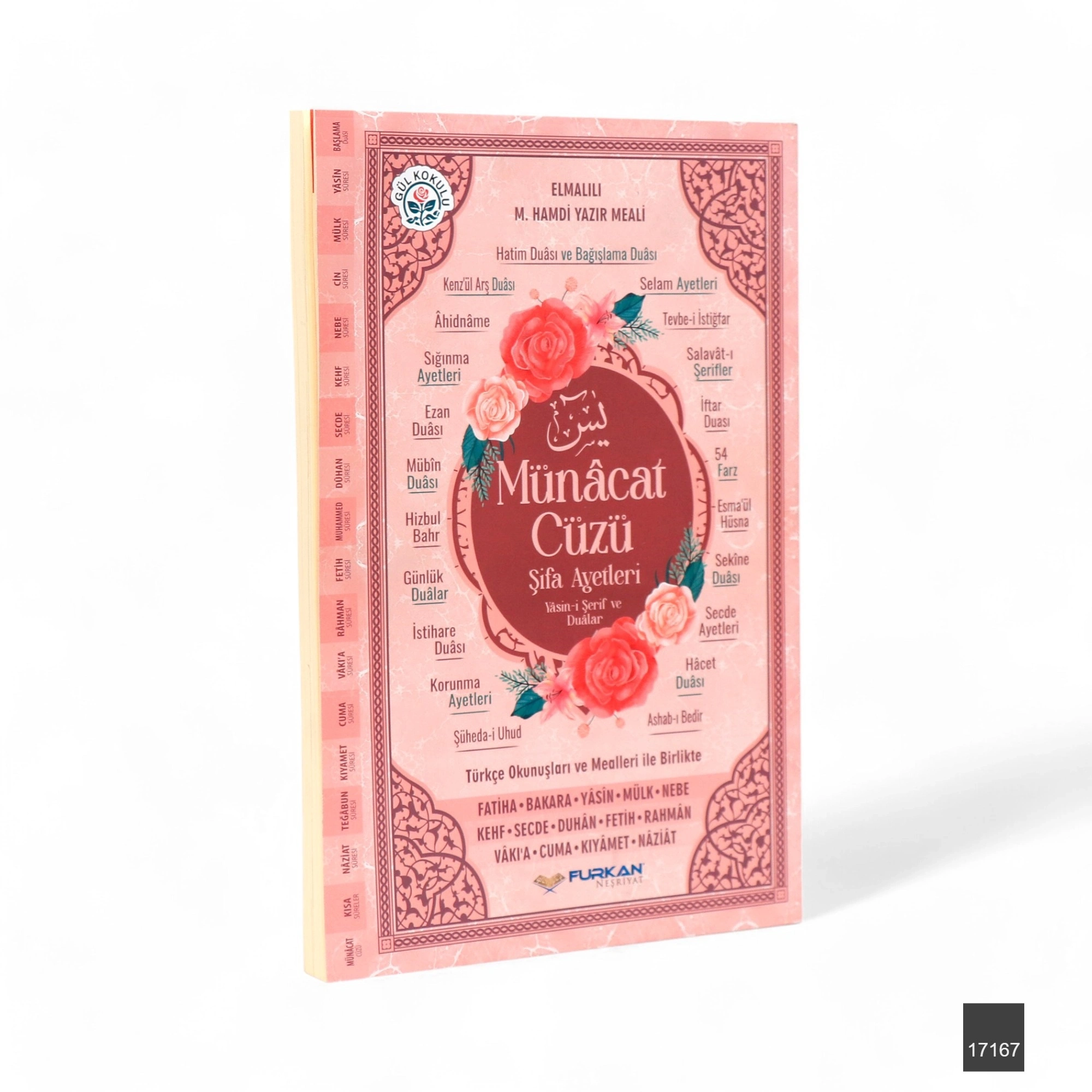 İçeriğinde Yasin-i Şerif ve Münacat dualarının yanı sıra Türkçe meal de yer almaktadır. Fihristli yapısı, aradığınız sûre ve bölümlere kolay erişim imkânı sunar. Gül kokulu sayfaları ise her açışta hoş bir rayiha ile karşılar. Karton kapaklı yapısı sayesinde hafif ve taşınabilirdir.