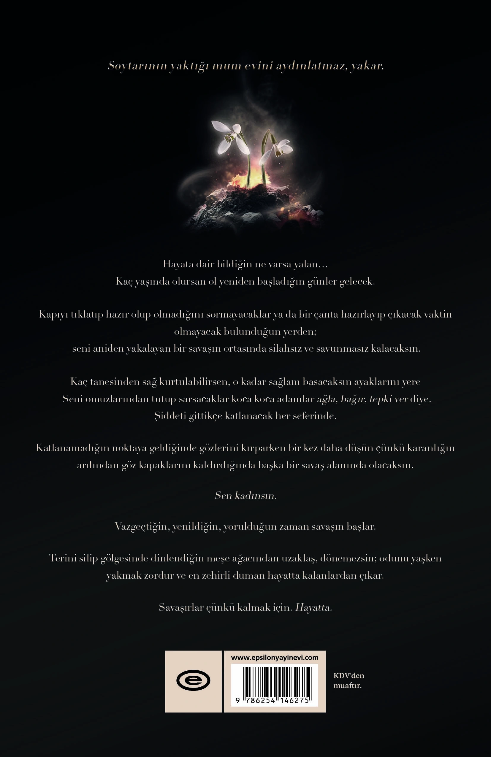 Hayata dair bildiğin ne varsa yalan... Kaç yaşında olursan ol yeniden başladığın günler gelecek. Kapıyı tıklatıp hazır olup olmadığını sormayacaklar ya da bir çanta hazırlayıp çıkacak vaktin olmayacak bulunduğun yerden; seni aniden yakalayan bir savaşın ortasında silahsız ve savunmasız kalacaksın. Kaç tanesinden sağ kurtulabilirsen, o kadar sağlam basacaksın ayaklarını yere Seni omuzlarından tutup sarsacaklar koca koca adamlar ağla, bağır, tepki ver diye. Şiddeti gittikçe katlanacak her seferinde. Katlanamadığın noktaya geldiğinde gözlerini kırparken bir kez daha düşün çünkü karanlığın ardından göz kapaklarını kaldırdığında başka bir savaş alanında olacaksın. Sen kadınsın. Vazgeçtiğin, yenildiğin, yorulduğun zaman savaşın başlar. Terini silip gölgesinde dinlendiğin meşe ağacından uzaklaş, dönemezsin; odunu yaşken yakmak zordur ve en zehirli duman hayatta kalanlardan çıkar. Savaşırlar çünkü kalmak için. Hayatta.